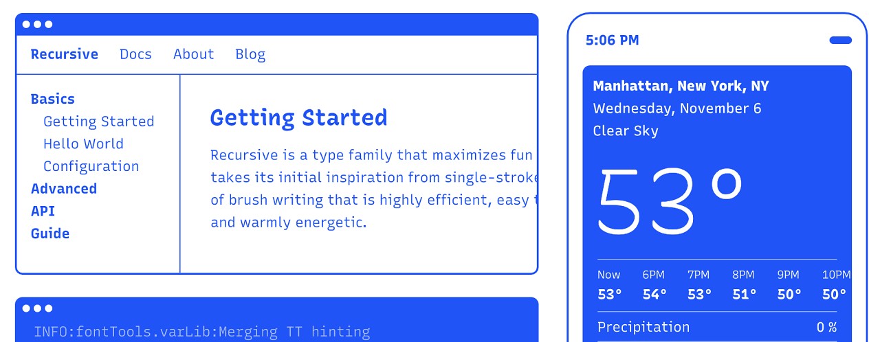 Recursive Sans and Mono: A Free Variable Type Family — This is a new ‘highly-flexible’ type family that takes advantage of variable font tech to let you pick the right style along five different axes. It’s pretty clever, well demonstrated, and very suitable for presenting data, code, or to be used in documentation and UIs. Latest release here. Arrow Type |